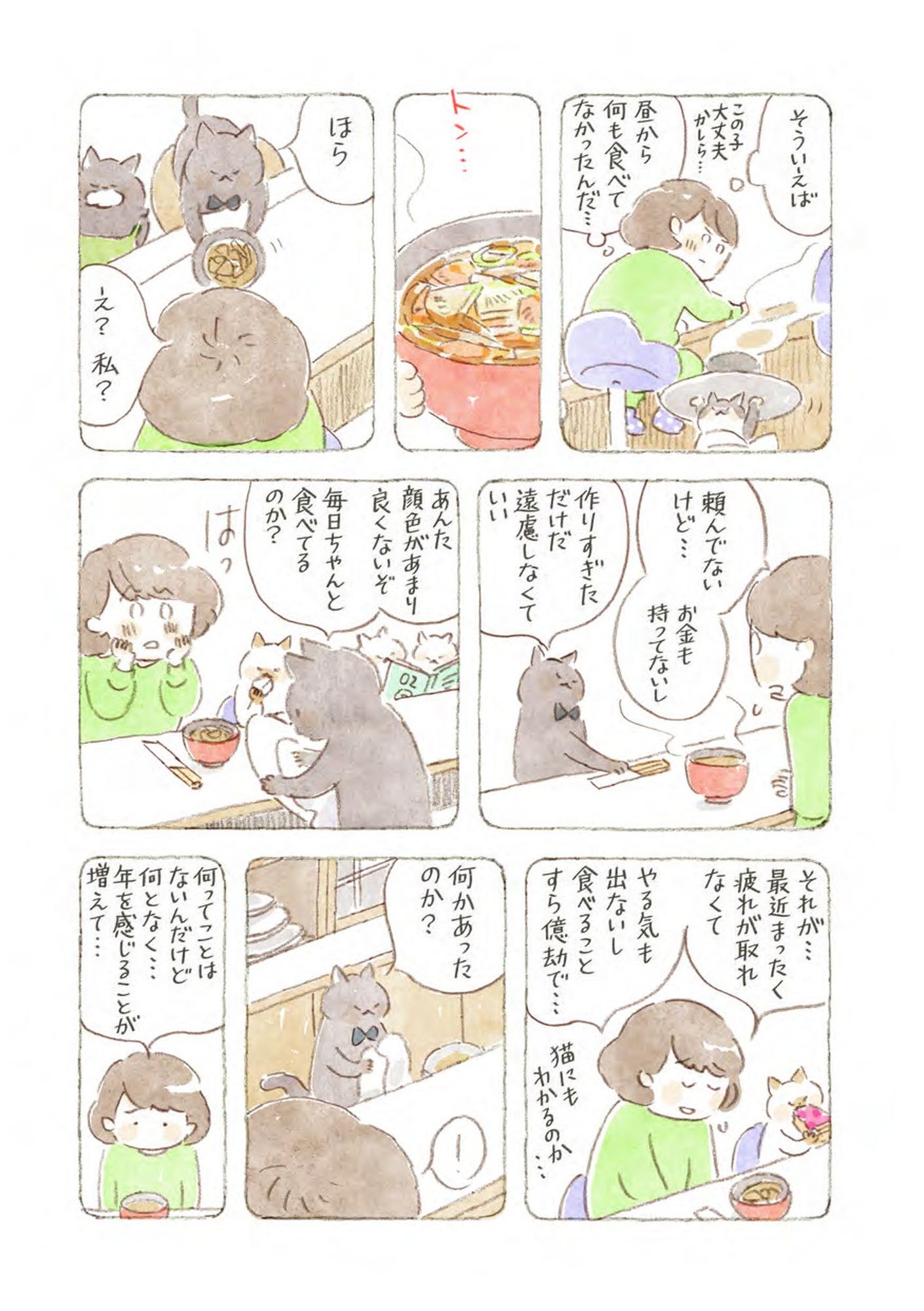 真夜中に猫が集まる喫茶店に迷い込む悩める人間たちが、猫たちとおいしいメニューに癒されるストーリー。
