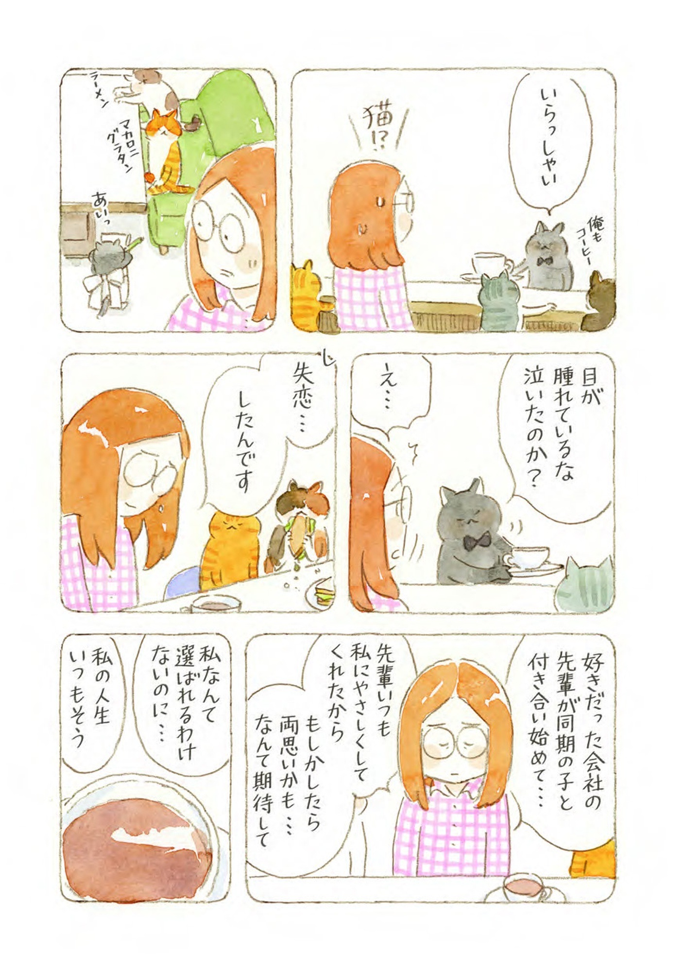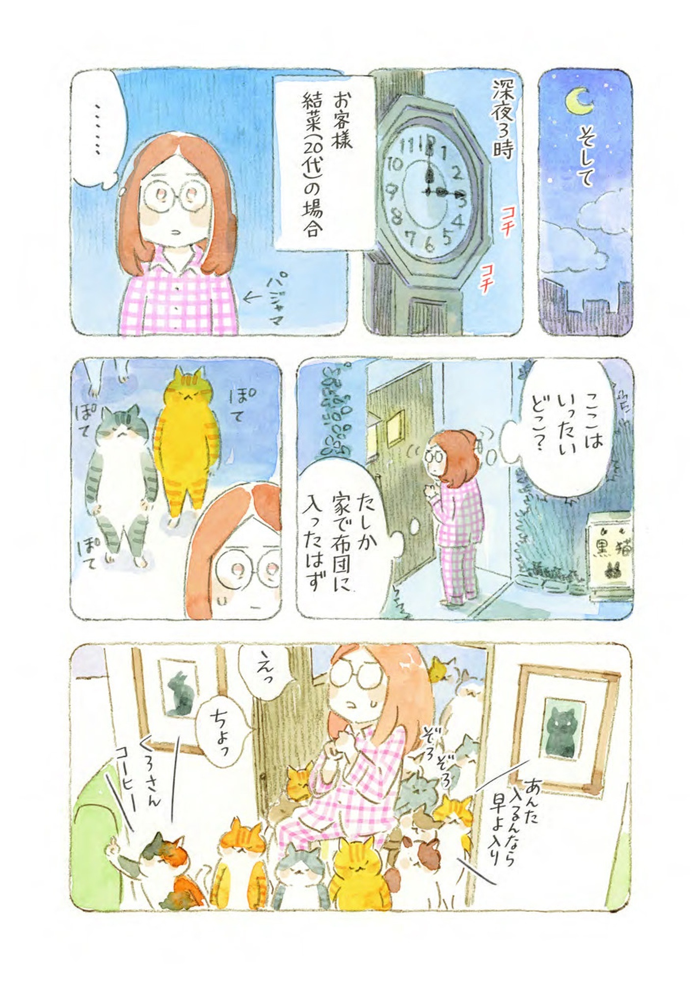 真夜中に猫が集まる喫茶店に迷い込む悩める人間たちが、猫たちとおいしいメニューに癒されるストーリー。