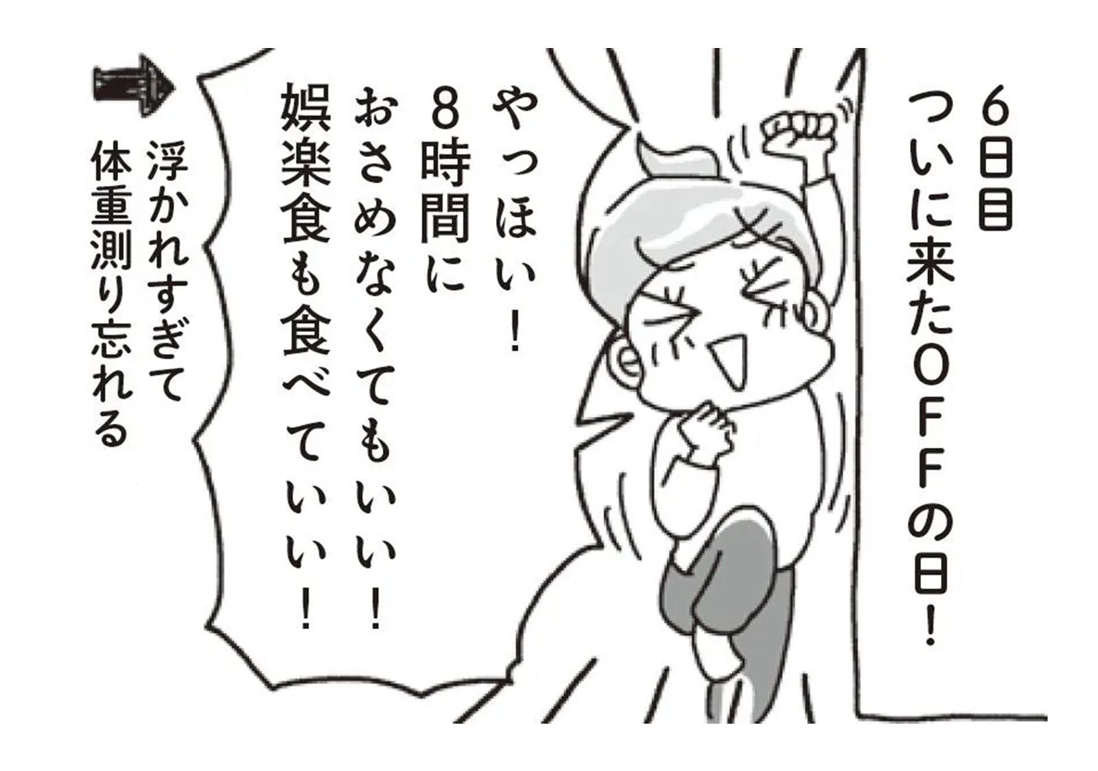 お待ちかねの「オフ」の日。あれもこれも食べちゃった…でも、翌日の体重はコーチの予言通りで…?!【アラフィフ母さんが7kg痩せた!奇跡の仕組みダイエット #17】