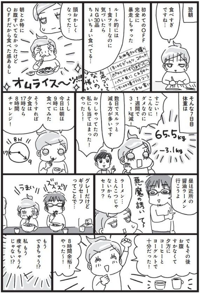 お待ちかねの「オフ」の日。あれもこれも食べちゃった…でも、翌日の体重はコーチの予言通りで…?!【アラフィフ母さんが7kg痩せた!奇跡の仕組みダイエット #17】