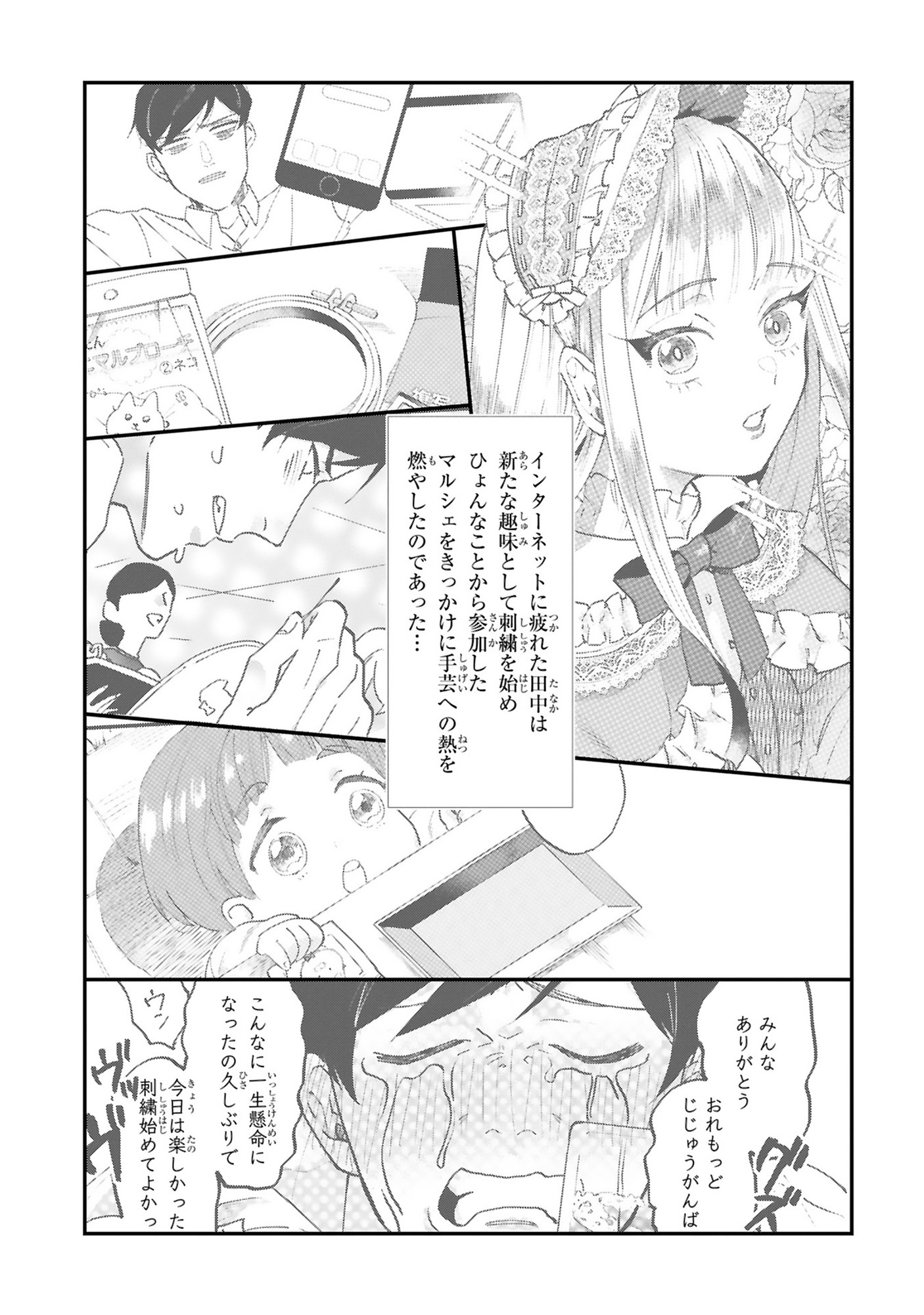 SNSや終わらない仕事に疲れ切ったサラリーマン・田中。無の心を求め刺繍を始めるも不器用で図柄はぐちゃぐちゃ。