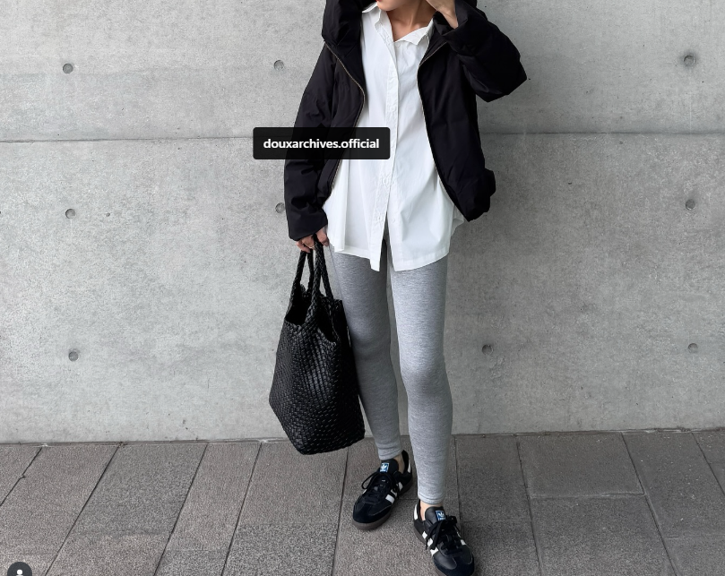 コンパクト丈のダウンに、きれいめな白シャツをレイヤードすることで、顔周りが明るく、全体に軽やかな抜け感が生まれています。ボトムスにはグレーのレギンスパンツを合わせて、スポーティかつリラクシーな雰囲気に。重くなりがちな黒ダウンも、白とグレーでメリハリを出すことで、洗練された大人の着こなしになりますね。足元とバッグを黒で統一することで、全体のバランスがきれいに整っています。