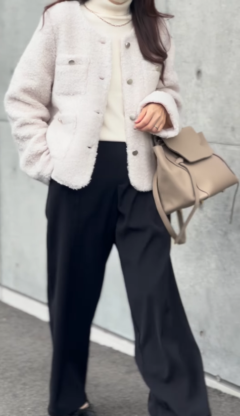 トレンドのジャケットが主役の、上品なモノトーンコーディネートですね。インフルエンサーの_____shiiiiさんが着ているのは、pierrotのブークレー素材のジャケットです。毛足の短いふわふわとした素材感がかわいく、ベージュがかったやさしい色合いが、きれいめな雰囲気にぴったり。ポイントは、フロントにあしらわれたゴールドのボタン。アクセサリーのような役割も果たしていて、シンプルながらも華やかな印象をプラスしてくれます。インナーには白のタートルネック、ボトムスには黒のきれいめパンツを合わせて、ベーシックカラーでまとめることで、ジャケットの素材感が際立っています。コンサバになりすぎず、普段使いしやすいきれいめカジュアルの完成です。