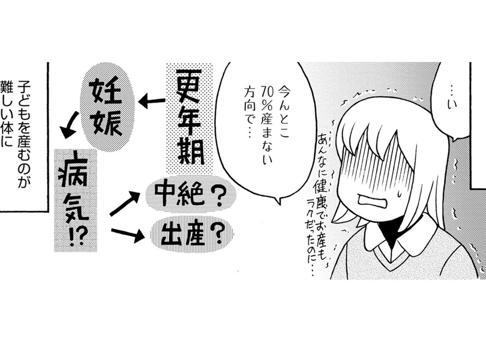 46歳で自然妊娠したらどうする?…しかも大きなチョコレート嚢腫が!産むならハイリスク出産【アラフィフ漫画家 更年期かと思ったら妊娠してました #4】 2025.11.29 LIFE 更年期かと思ったら 試し読みマンガマンガ試し読み試し読み その日、漫画家・東條さち子も「生理」が来ていないことに気がついた。 「更年期」が来た。そう思いながらも旦那に言われて冗談交じりに妊娠検査薬を試したところ、なんと結果は陽性! 病院で検査すると妊娠に加えて大きな卵巣嚢腫まであることが発覚!! 高齢出産は可能なのか? 嚢腫を取るために手術が必要!? 人気女性漫画家が、50代を前に直面した「更年期」との闘いを描くエッセイ!! ※本記事は東條さち子著の書籍『アラフィフ漫画家 更年期かと思ったら妊娠してました』から一部抜粋・編集しました。 ▶Renta!『アラフィフ漫画家 更年期かと思ったら妊娠してました』 ▶30日間無料▶ Amazonの読み放題をチェック! 【99円で2カ月間】 Audible が無制限で聴ける! ▶楽天KOBO 初回購入金額のポイント最大70倍! スポンサーリンク 続きを読む 次のページへ >> 1 2 3 【注目の記事】 1番対策が難しかった…!頬のたるみやほうれい線につながるNG食事習慣最後のひとつ 冬の寒さに負けない!そろそろ準備したい中綿アウター×【ユニクロ】バズりデニムの着こなし【40代の毎日コーデ】 【ユニクロ】カシミヤタッチニットで魅せる!旬のブラウンを効かせた洗練肩掛けテク【40代の毎日コーデ】 東大生が注意喚起!「鵜呑みにしてはいけない」SNSで「でたらめの受験情報」を発信する人の特徴とは 「東大受験が簡単!?」な難関私立高出身者。天才たちの受験勉強、その驚きの実態とは この記事は OTONA SALONE1 スポンサーリンク スポンサーリンク 【人気の関連記事】 40代。もう私、いつ死んだっていい気がするけど | あした死ぬには、#1 突然の病気。更年期障害。取れない疲労、お金の不安、これからの人生の迷い……。40代がぶち当たる「壁」をあまりにもリアルに描き出し、熱く静かな共感をさらった雁須磨子さ… 人前では「完璧な夫婦」を演じる夫。普段は私を無視してるって、誰も知らない【女40代はおそろしい#11】 40歳・フリーデザイナーの丸山ふさ子。 夫との攻防戦の末、「共働きだけど夫のほうが家事育児多め」という関係にやっとたどり着く。バリキャリ会社員のまい、起業家のかお… 年齢、たまに忘れてない?アラフォーあるあるが「共感しかない」と話題 「最近、若い頃と比べて何かが違う……」そんなモヤモヤを抱えているアラフォーのみなさん、必見!イラストレーターのRingoman(@ringo_fashion)さんがインスタグラムに投稿…