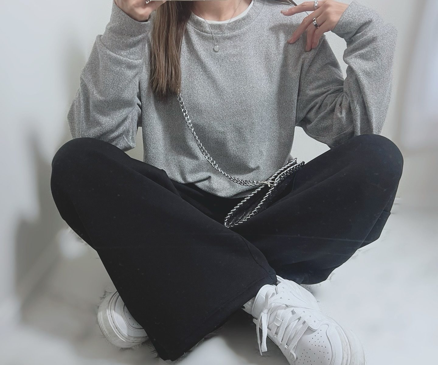 今回は、グレーのフリースTシャツに黒のワイドパンツを合わせ、シンプルでシックなモノトーンでまとめています。トップスがコンパクトな着丈なので、ボリュームのあるボトムスと合わせても、バランスよく着こなせるところが優秀。ネックレスが、シンプルなクルーネックのアクセントに。