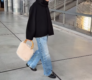 シンプルカラーのコーディネートのオシャレを格上げしているのは、やわらかいファー素材のバッグを合わせたことでしょう。このファーバッグが、シンプルなコーディネートに季節感とやさしいアクセントを加えています。足元を黒のパンプスやショートブーツで引き締めることで、デニムのカジュアルさが抑えられ、大人の女性らしいきれいめな仕上がりに。