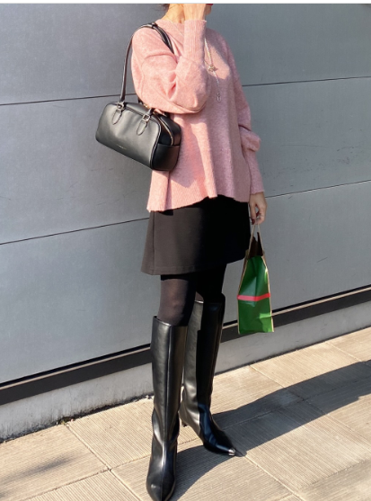 冬の装いに華やかさをプラスしてくれる、きれいなピンク色のニットが主役のコーディネートです。インフルエンサーのpearl3028さんが着用しているのは、脇編みボリューム袖ショート丈ニット。やさしいニュアンスカラーのピンク色と、ゆるっとしたシルエットがかわいらしく、着るだけで顔色が明るく見えそう。ショート丈なので、ボトムスに黒のスカートやパンツを合わせても、バランスがとりやすく、スタイルアップも叶います。今回は、黒のミニスカートとショートブーツを合わせ、甘くなりすぎない大人カジュアルにまとめています。着回ししやすいベーシックなデザインなので、色違いでそろえたくなるアイテムです。