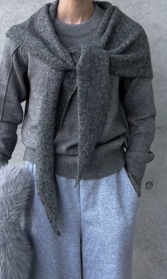 冬の装いで取り入れたいワントーンコーディネート。全身をグレーで統一したmi___.5さんの着こなしは、重くなりがちな冬のファッションに軽快なムードを加えています。ただ色を揃えるだけでなく、ニットやスウェット、ファーといった異素材のアイテムを組み合わせることで、奥行きのある洗練されたスタイルが完成。特に、首元に巻いたグレーのニットと、トップスのざっくりとした編み地の質感が、着こなしのアクセントに。