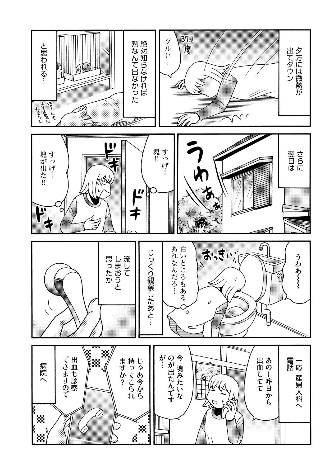 妊娠判明から1週間後、出血。塊だけでなく、白いものも⁉病院へ電話【アラフィフ漫画家 更年期かと思ったら妊娠してました #9】