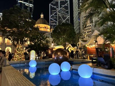 クリスマスライトアップと、クリスマスマーケットが集まる「ウィンター・ワンダーランド」は、昨年まで九龍サイドで開催されていましたが、今年は久しぶりにセントラルエリアの中心部、地下鉄セントラル駅前のスタチュー・スクエア・ガーデンに戻ってきました。