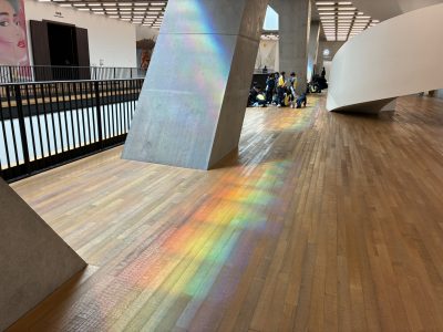 天窓から射す光が虹色の影を落とす、この作品は韓国の女性作家、金守子のもの。