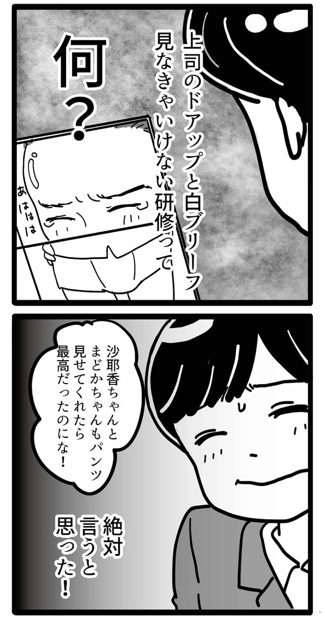 今日も最悪な1日。上司のドアップと同僚のブリーフを見る研修って一体…【我が社が昭和すぎる件 セクハラ・パワハラ上司に制裁を! #3】