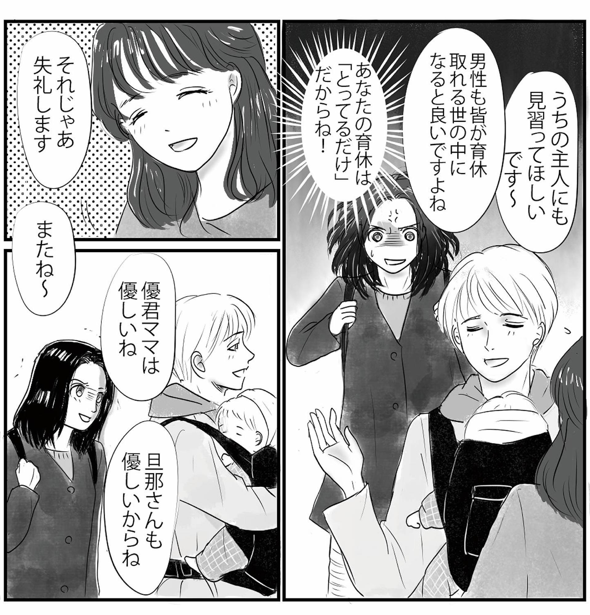 渋る夫に娘を抱かせてどうにか散歩へ。通りすがりのママ友たちに対する夫の反応は?【とるだけ育休の夫はいらない #3】