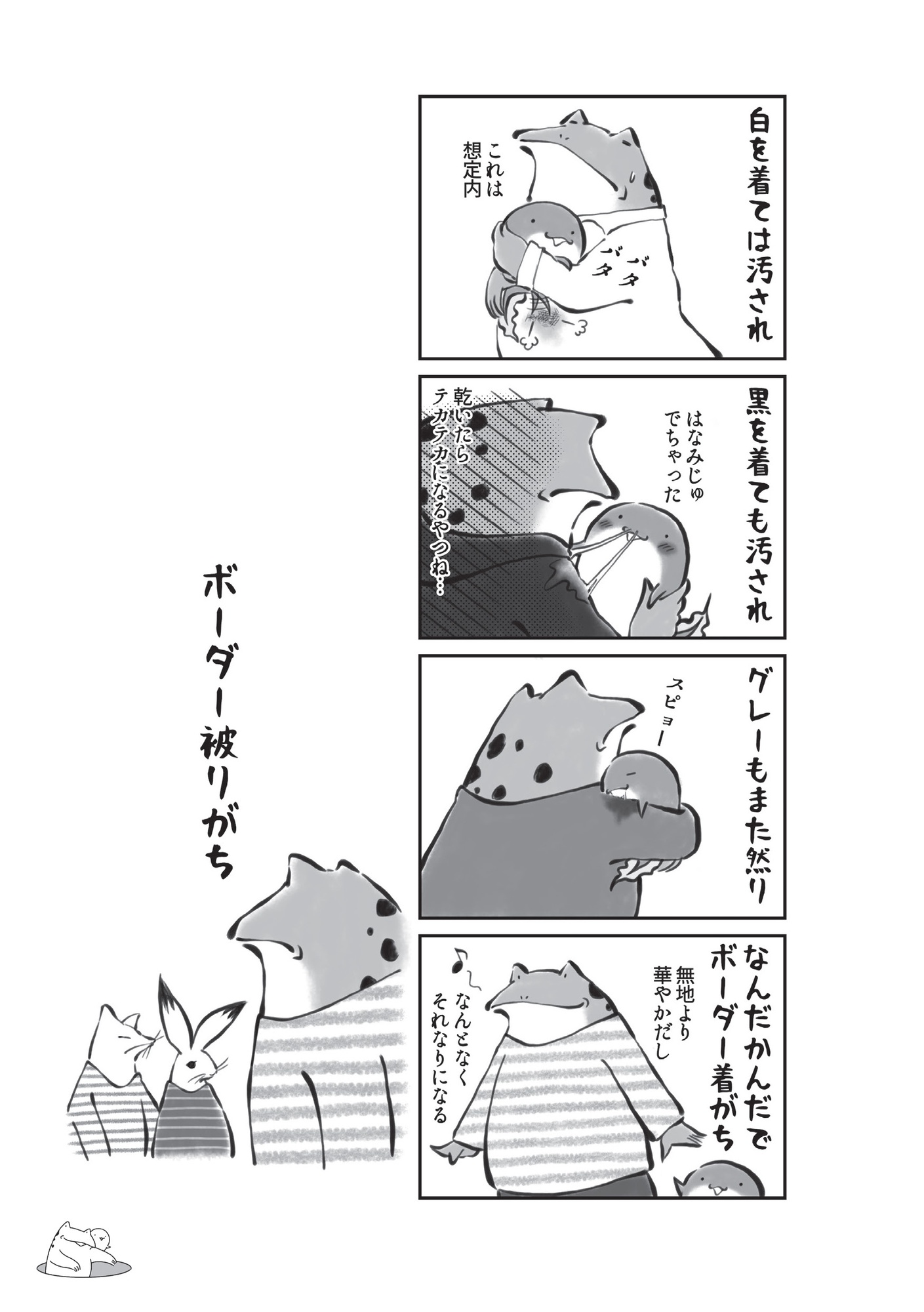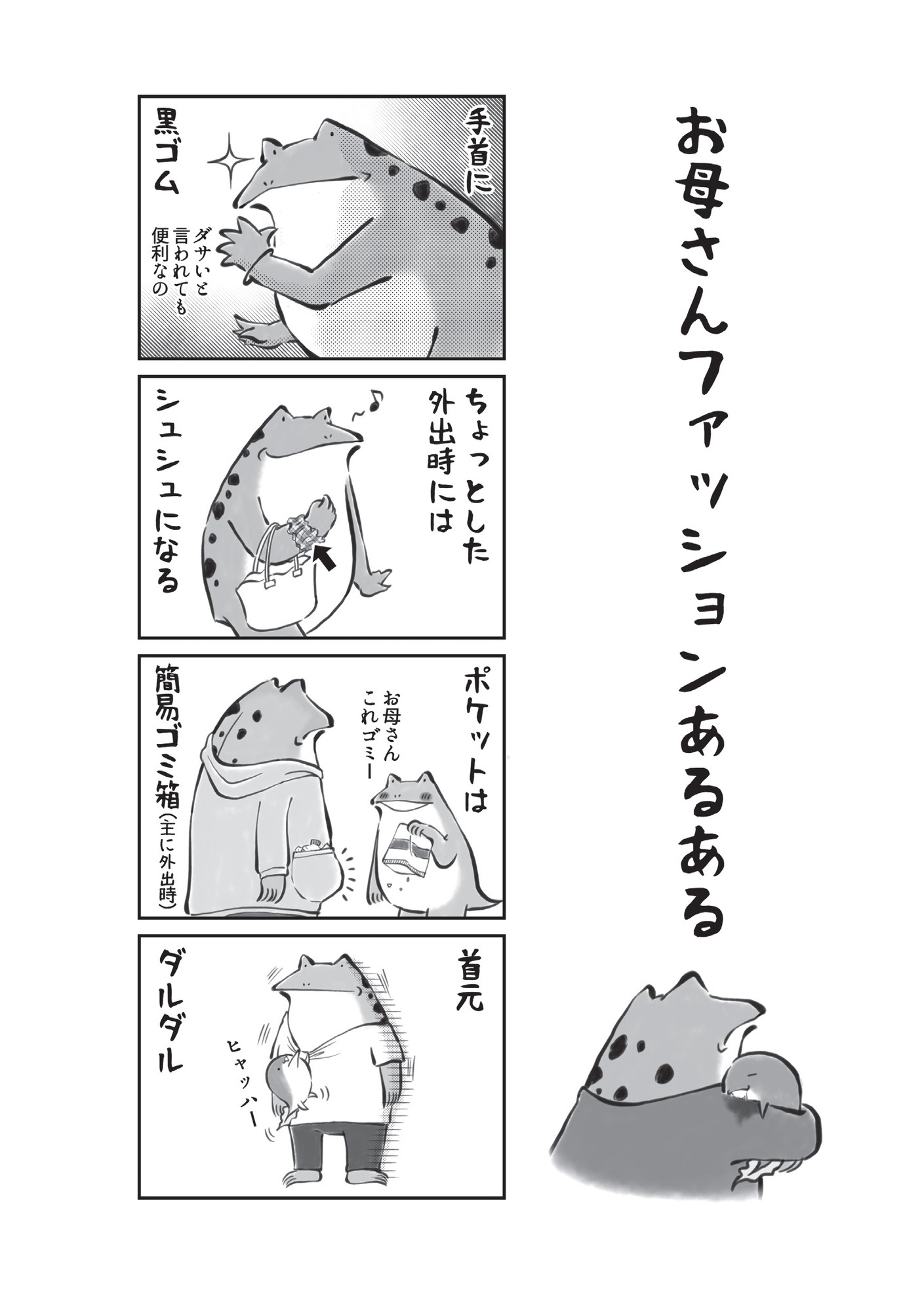 ファッションも多様性!? 紐は引っ張られジッパーは上げ下げされ… ポケットはゴミ箱に変身…【カエル母さん #13】