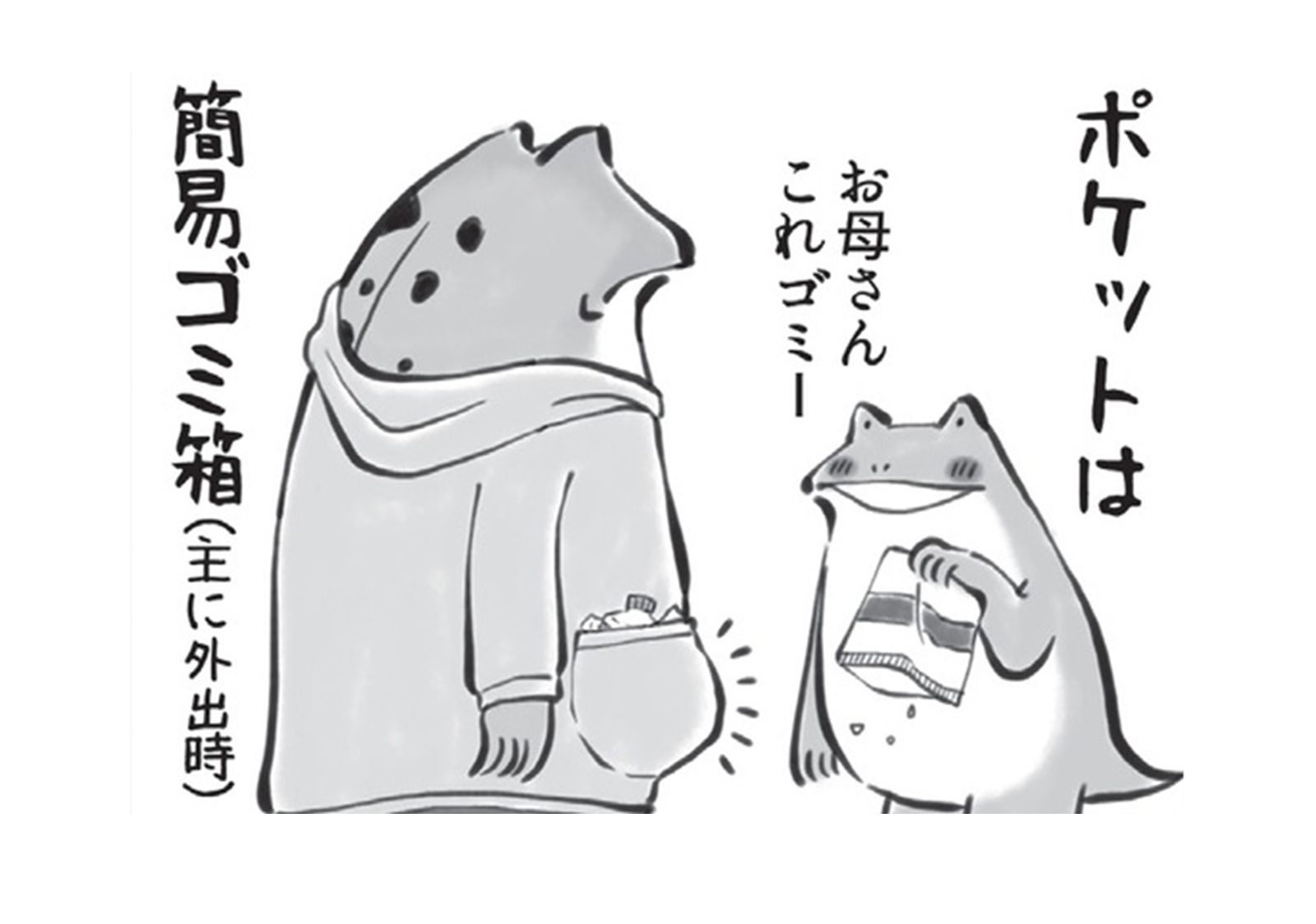 ファッションも多様性!? 紐は引っ張られジッパーは上げ下げされ… ポケットはゴミ箱に変身…【カエル母さん #13】
