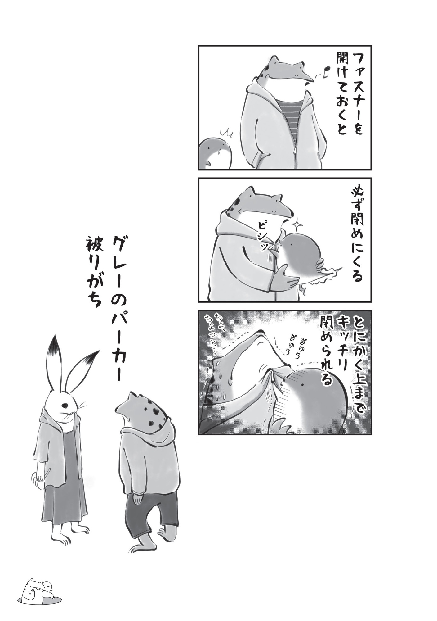ファッションも多様性!? 紐は引っ張られジッパーは上げ下げされ… ポケットはゴミ箱に変身…【カエル母さん #13】