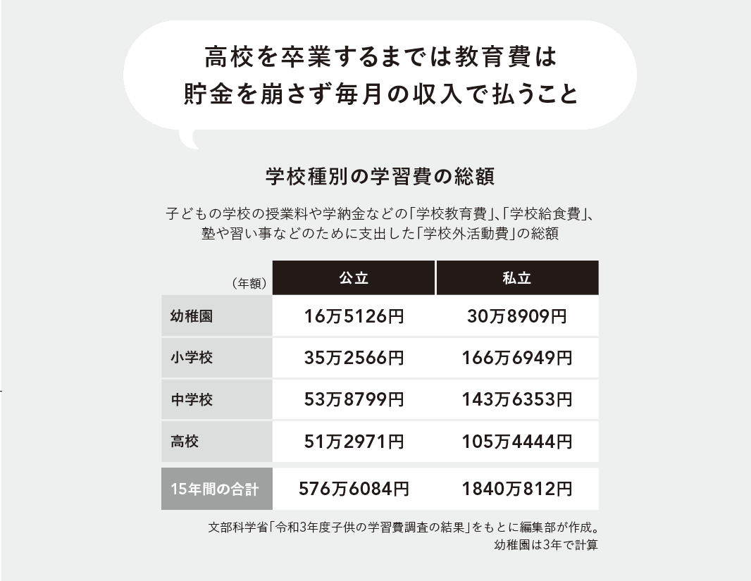 【関連画像】高校卒業までにかかる私立・公立の「教育費」は? かけてもいい教育費の「上限」、月収から割り出す計算法も