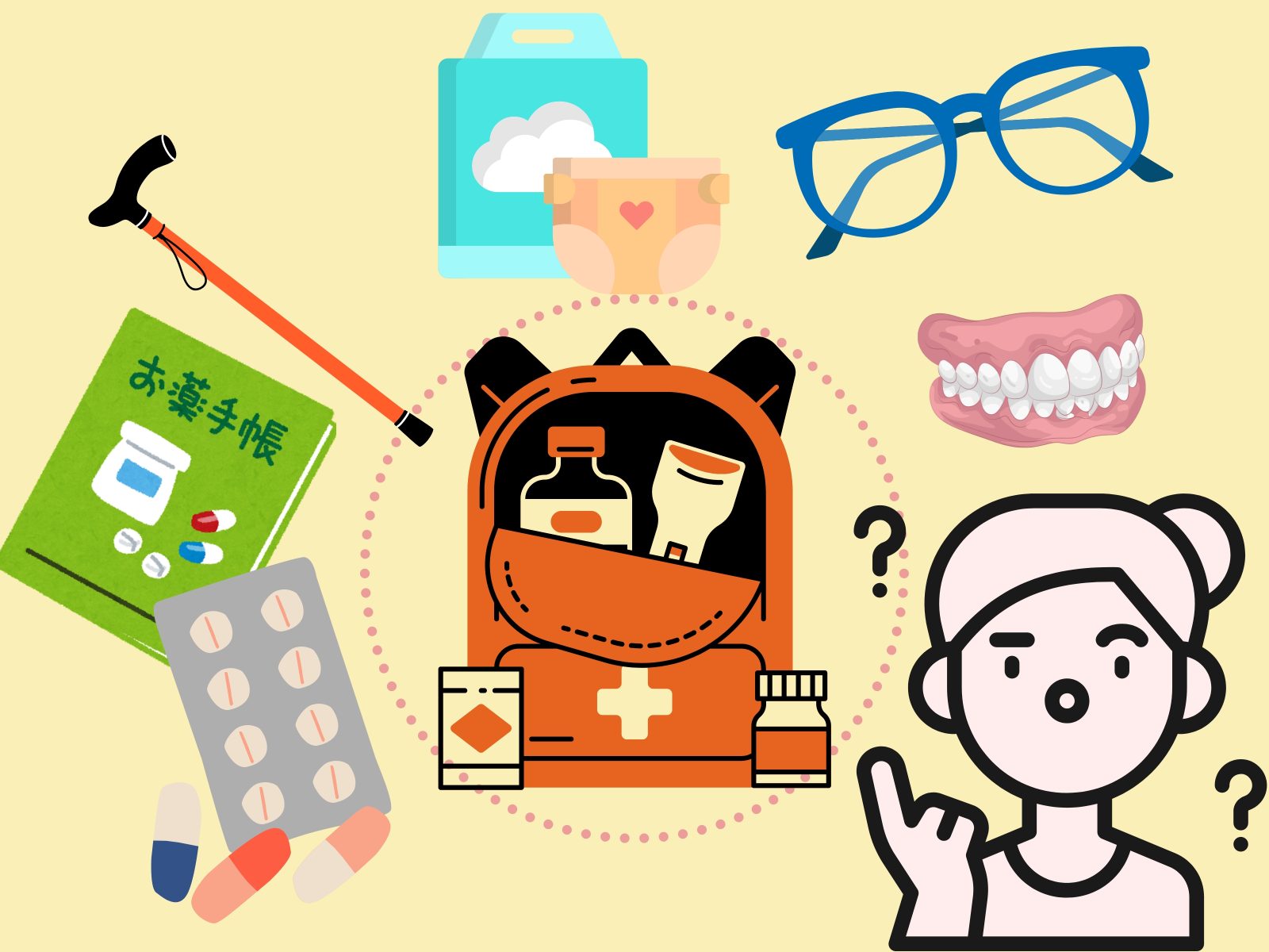 命を守るために必要な防災用品の中で、最も重要な道具は「身体の一部」です。ライトも雨具も笛も重要な道具ですが、それ以前に「そもそもこれがないと日常生活が送れない」という道具がある場合、こうした道具の予備が必須となります。