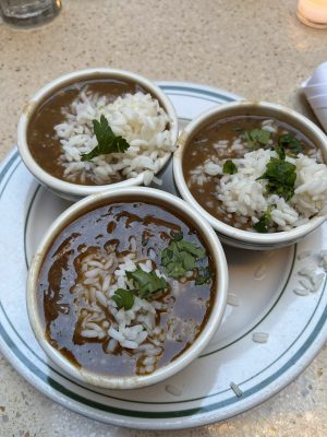 お昼ごはんに、ガンボを食べに向かいます。ガンボはニューオーリンズの名物料理です。ごはんにおだしのスープがかかっています。店員さんが「ちょっとずつ食べれるのもあるよ~」と教えてくれて、3種盛りを試しました。シーフードが非常においしかったです。