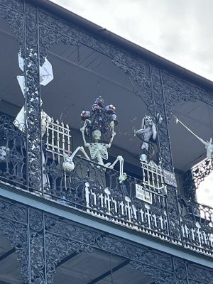 が、街はやはりお祭りモードでした。ハロウィンもそうですが、アメリカ人はおうちの飾り方に尋常ならざる気合いが入っています。ベランダにおめかししてふんぞり返っている骸骨や幽霊が狂喜乱舞していて、陽気です。夜は仮装してさらにお酒が入った人々がどんちゃん騒ぎをし、マルディグラ名物のおもちゃのネックレスが2階から投げ飛ばされ、街全体が完全に仕上がっていました。