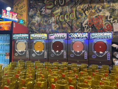 飲み物のお店はいっぱいありましたが、フローズンのお店が多いこと、そのフローズンのマシンがかならずたくさん並んでいることに気づきました。よくよくそのフローズンを見てみると、フローズンは全部お酒でした。ダイリキ、ハリケーンなど、お酒のフローズンを片手にお散歩するのです。