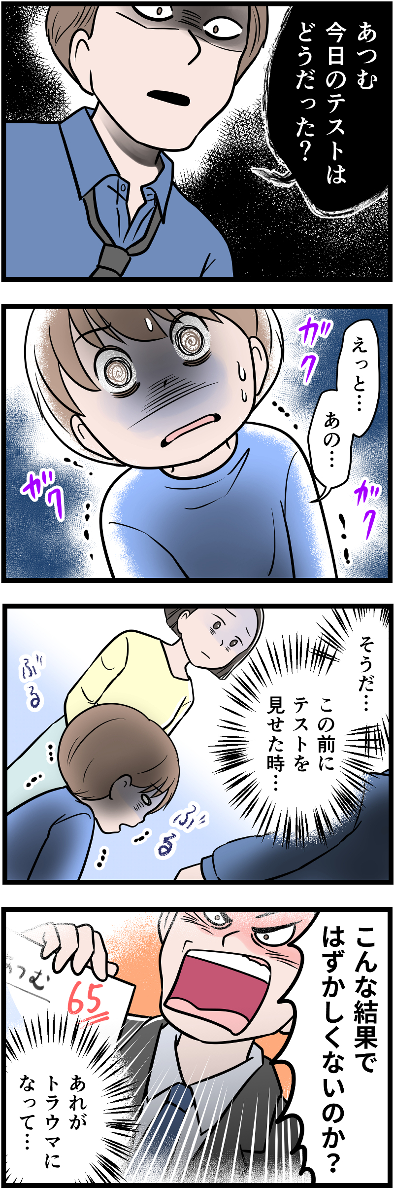 前回のテストで65点を取ってしまった、あつむ君。まだ小学校2年生なので、常に優秀さを求めるのは酷というもの。しかし夫は「こんな点数で恥ずかしくないのか!」と怒鳴りつけたのです。それがトラウマになって、父親の前で震えが止まらなくなり…。
