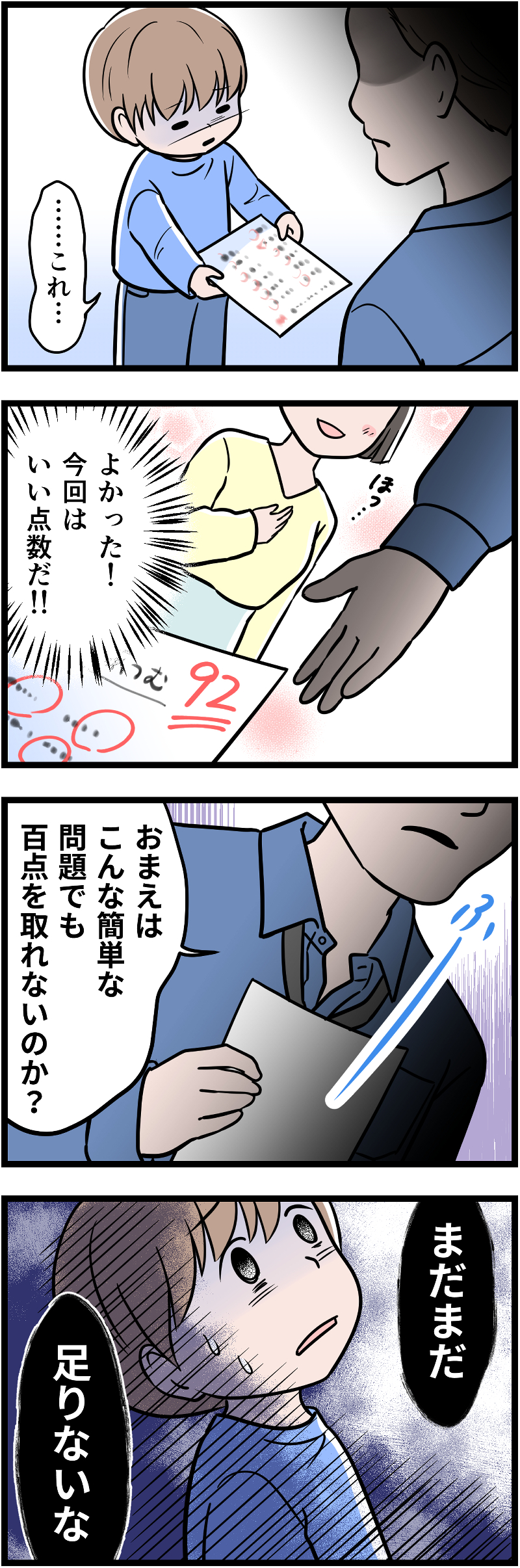 「100点以外はダメ」という価値観の夫…。せっかく頑張ったであろう息子は「まだまだ足りないな」と言われ、愕然とした表情を浮かべるのでした。