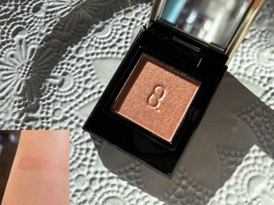 パールの輝きが繊細で上品。公式サイトによると甘さ控えめのピンクということですが、画像のように黄みが強めで肌に乗せると黄みの強いベージュにも見えます。そのためまぶたにハリ感が出て、単色で仕上がることによって目元がスッキリ印象的に見えます。