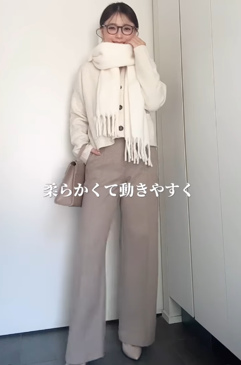 寒い日でも軽やかにおしゃれを楽しみたいなら、sato_atsuko_さんの淡色使いが参考になるはず。ユニクロの「ブラッシュドジャージーワイドパンツ」値下げで1,990円(サイズ男女兼用S着用)は、起毛感のある素材で見た目も暖か。センタープレスが脚のラインをまっすぐきれい整えてくれるのも嬉しい。