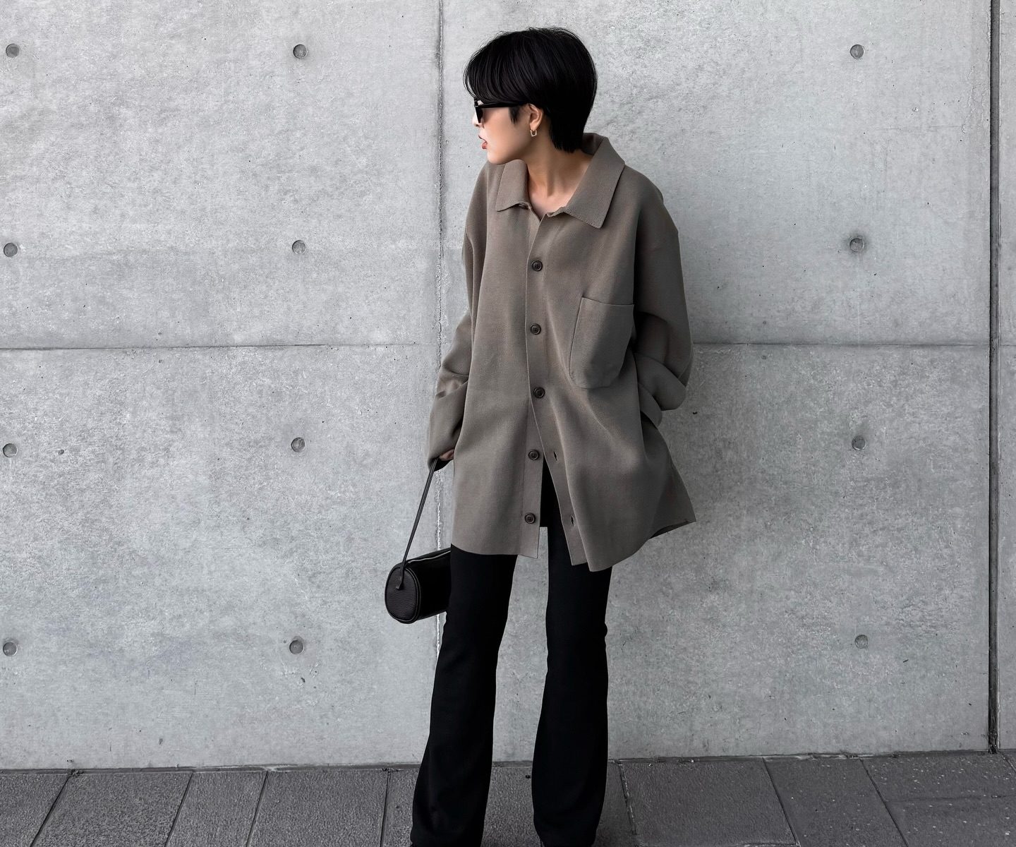 カジュアルすぎず、きれいめな印象もキープしたい大人の冬スタイルに、mi___.5さんはユニクロのメンズアイテムを取り入れた絶妙なバランスを提案しています。主役は「ミラノリブシャツカーディガン」値下げで2,990円(158cmでサイズ3XL着用)です。あえて大胆なビッグサイズを選ぶことで、体が泳ぐようなゆとりが生まれ、かえって華奢で洗練されたムードを醸し出しています。襟付きのデザインなので、スウェットよりも端正な表情に見えるのが40代にうれしいポイント。