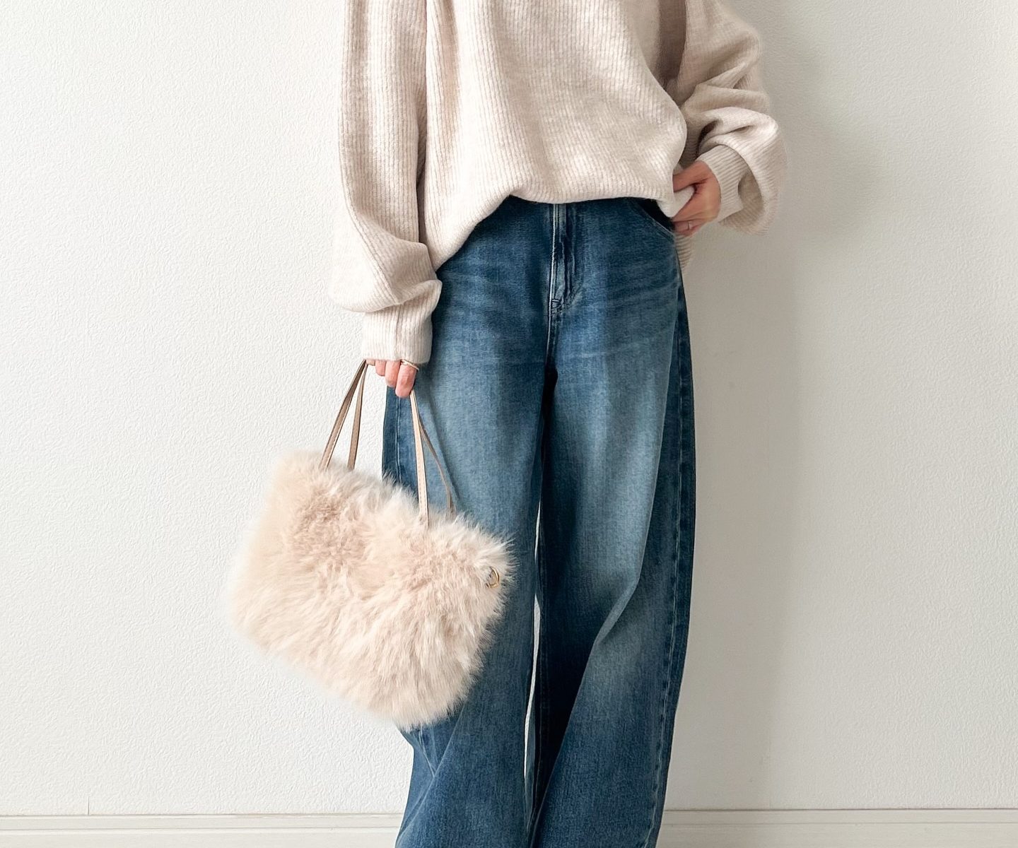 ゆとりのあるワイドデニムにフロントだけ軽くインすることで、ウエスト位置を高く見せつつ、気になる腰まわりを自然にカバーできます。足元にはきれいめなパンプスを合わせ、バッグにファー素材を取り入れることで、季節感のあるアクセントをプラス。シンプルながらも計算されたシルエットが、都会的で洗練された印象を与えてくれます。