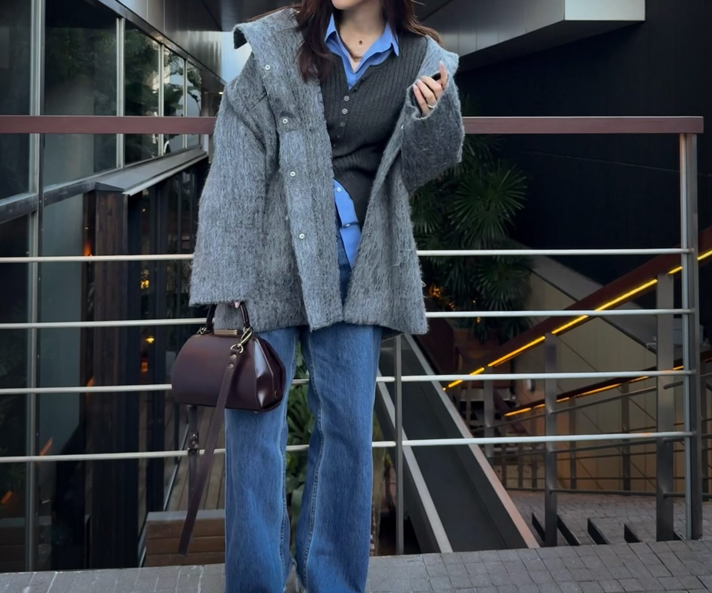 ボトムスには程よくゆとりのあるデニムを合わせ、全体のトーンをブルーとグレーで統一することで、カジュアルながらも品よくまとまっています。仕上げに深みのあるボルドーのハンドバッグを添えれば、落ち着いた大人らしさが加わり、洗練されたスタイルが完成します。