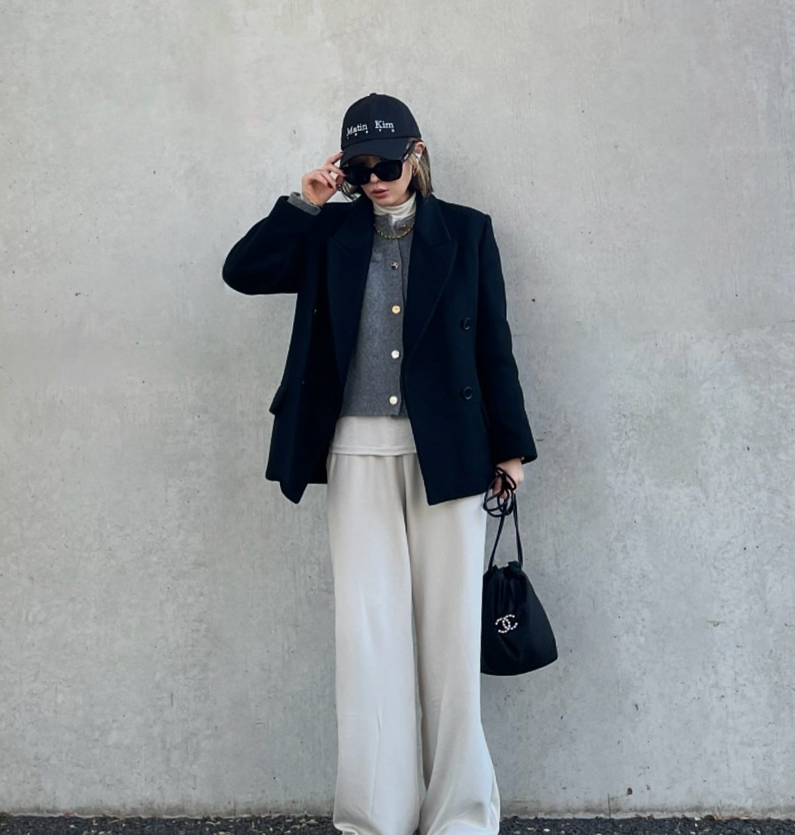 puu326さんは、上下ユニクロのアイテムに華やかなゴールドボタンのニットカーディガンを合わせた、品格漂うカジュアルスタイルを提案しています。インナーにはユニクロの「ソフトリブタートルネックT」1,990円(170cmでサイズM着用)をセレクトし、ボトムスには「スウェットワイドパンツ」2,990円(170cmでサイズM着用)を組み合わせて、リラックス感のある着こなしに。カジュアルなスウェットも、ハリのある素材のカーディガンを羽織るだけで、一気にジャケットのようなきちんと感が加わります。