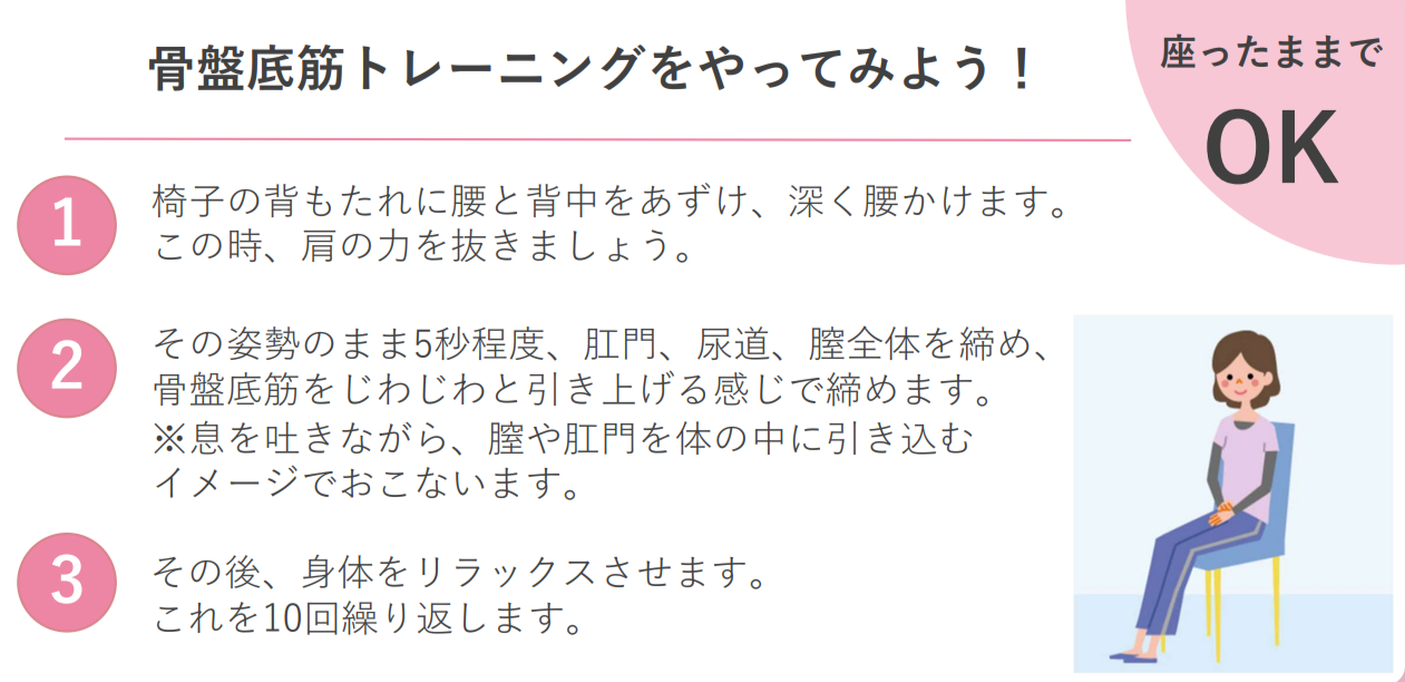 「対策もないだろうから我慢するしかない」というイメージがありますが、そんなことはありません、骨盤底筋はケーゲル体操など家庭で手軽にできる運動で正しくトレーニングすれば3~6か月ほどで80%が効果を実感できると言われています。試しに座ったままでできるトレーニングを試してみてください。