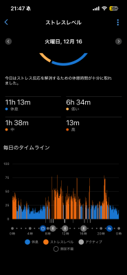 ストレスや睡眠は、バッテリーが24時間以上持つスマートウォッチなら各社計測して何かしらスコア化していると思うのですが、私はガーミンの表現ってすごくグラフィカルでわかりやすいなと他社のグラフを見るたび思います。