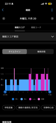 上記、88点の日の睡眠データです。4本ある細くて背が高い薄ピンクの線が「目が覚めちゃった」ところです。このように何度も目が覚めています。しかし、右側の太くて短い濃いピンクの線、レム睡眠をなんども繰り返し、結果的に回復できる睡眠が取れたと評価されました。