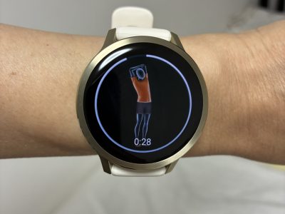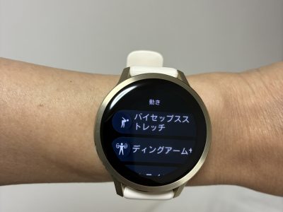 もうひとつ、最近気に入っているのがこの機能です。しばらく座りっぱなしで仕事をしていると、突如ガーミンから「ストレッチしなさいよ」とメッセージが入るのです。そのストレッチも本当にカンタンなものばかりで、