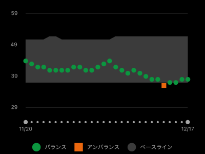 上の図は最近のものですが、1つだけ出たオレンジは過労で「もう休め」のタイミングでした。逆に、少々風邪をひいても、HRVがすぐ下げ止まったなら「大丈夫だな」。がくっと下がったときと、オレンジが出たときは休む、この2つは絶対ですが、休養でじゅうぶん回復できたのかが数値的に判断できるようになった結果、私に関しては「病は気から」がなくなりました。