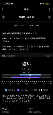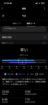 最近新実装された機能が「睡眠アライメント」。個人の体内リズムを可視化し、そのリズムに合わせて理想的な睡眠が取れているかを確認・サポートするものです。「いつ寝ていつ起きるのが最適か」という睡眠の一貫性、アライメントに注目し、いつ寝るとよいのか指示を出してくれます。