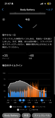 グラフ内の青色の棒グラフが休息、オレンジ色の棒グラフがストレス、白色の折れ線グラフがボディバッテリーを表しています。上図では青の部分の休息でバッテリー(白い線)が回復して充電され、オレンジの部分のストレスで低下していく状況が示されています。