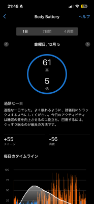 この週の金曜日、12月5日のデータをご覧ください。金曜はもうボディバッテリーが回復しきれず、最高値61から始まって、1日の終わりに5まで落ちています。
