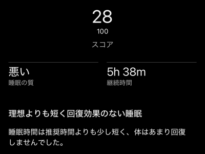 睡眠そのものは変わっていないのに、その解釈が変わる。すると体感までが180度変わる。ねー、主観やら印象やら記憶やらってこんなにいい加減なんですね。これに限らず、ネガティブな思いをもつ分野は片っ端から定量化して確認しなおすのが重要だなと思いました。