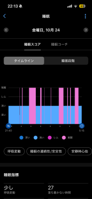 上記、88点の日の睡眠データです。4本ある細くて背が高い薄ピンクの線が「目が覚めちゃった」ところです。このように何度も目が覚めています。しかし、右側の太くて短い濃いピンクの線、レム睡眠をなんども繰り返し、結果的に回復できる睡眠が取れたと評価されました。
