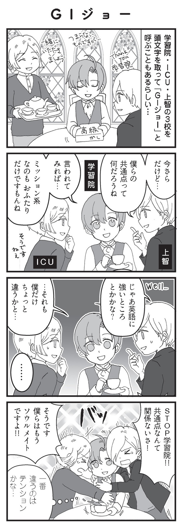 【東京四大学】「GIジョーってどこ大?」大学をまとめて呼ぶ名前、僕だけ他と違うところとは…?【擬人化マンガ 大学あるあるこれくしょん #6】