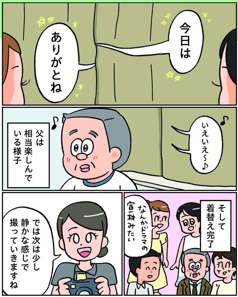なんとか撮影にも慣れてきて衣装チェンジに。カーテン越しの父の言葉にほっこり…【小林一家は今日も「ま、いっか!」 #8】