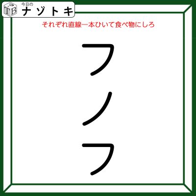 それぞれの文字に一本ずつ足して別のカタカナにして、食べ物の名前にする問題です。