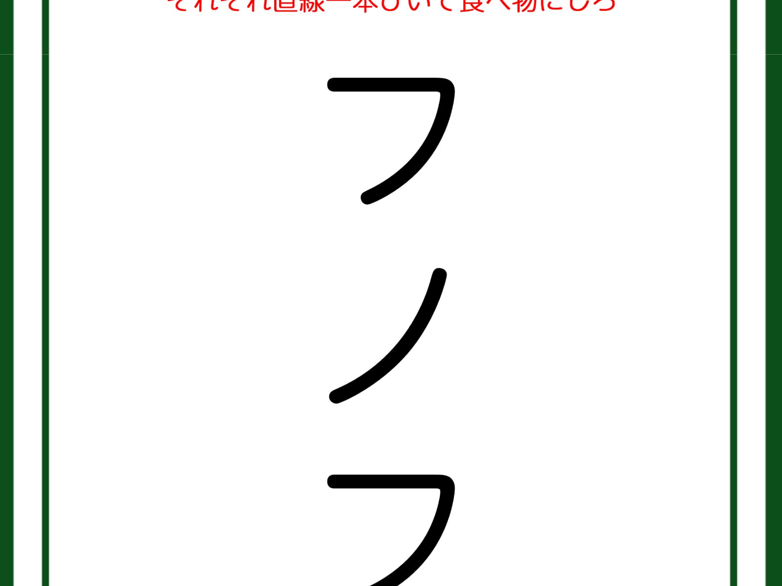 それぞれの文字に一本ずつ足して別のカタカナにして、食べ物の名前にする問題です。