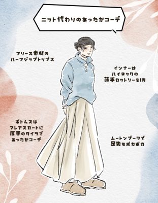 フリースと一言にいっても、おしゃれなアイテムも多いので着こなし次第で良し悪しは大きく分かれます。そこでおすすめしたいのがハーフジップタイプのフリースプルオーバーです。ハーフジップタイプはここ数年のトレンドファッションにもなっているので、普段のカットソーやワンピースの上から重ねるだけで、今っぽい着こなしが実現します。インナーはハイネックタイプにすると、しっかり首まで暖かい着こなしができると同時に全身で見た時に好バランスな着こなしが完成します。