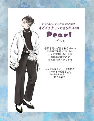 鉄板ではありますが、ピアスやヘアアクセサリーをつけるだけでも雰囲気は変わります。少し個性を表現したい方は、パールのつけ襟ネックレスやパールベルト、パールのミニバッグなども良いですね。黒い服が多い方はとくパールモチーフのアクセサリーをプラスしてみてください。