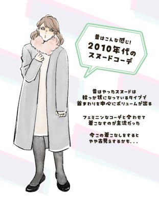 現在の定番となっているきれいめコーデにも通ずるスタイリングではありますが、アウターのサイズ感・コートやスカートの丈感・スヌードのデザインなどが微妙に古臭さを感じるかも……。ダサいとも言えず、かといって今っぽいとも言えぬハンパコーデになりやすいので気をつけたいところですね。